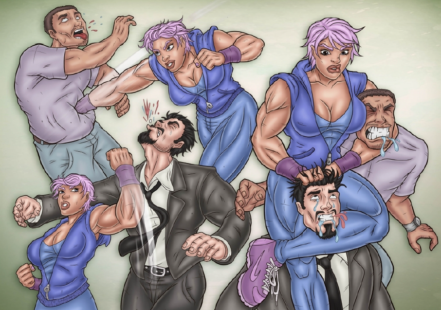 An out-of-shape person is in trouble. He has bad men after him and he out of shape. Luckylu, there's a group of muscle-bound women who going to help him get back on track