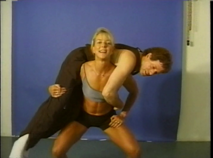 Here are some vital stats on the ever-so-powerful Rose. She is definitely an Amazon, weighing in at a shapely 160 pounds while standing 5'11" tall. Her long flowing blonde hair extends down her back like golden rays of sunshine. Her warm and friendly personality is such that it makes you feel like she is speaking to you right through the TV screen. And initially, that is what she does! The tape opens with Rose peering through a store window. From behind the window she challenges what is presumably a male (although we can't see anyone) to come inside so that she may lift and carry him like the helpless male that he is. This intriguing opening leads to acceptance on the part of the guy. Into the studio we go for what is the start of the "Lift Encyclopedia of Woman Power!" The male, who is about 5'9" and weighs about 155 pounds is promptly asked to jump onto Rose's muscular back for a piggyback ride. She carries him around the room with such ease it's almost as if he's not even there! She squats him, circles the room with him, all the while carrying on a conversation with the liftee. From there Rose picks him up in a straight-up lift, again displaying her awesome power. Oh, oh, Mr. Macho has been a bad boy, up he goes! She flings him over both of her shoulders in a great fireman's carry and squats him over and over again. I can only imagine what it must feel like being six feet off the ground at the mercy of a beautiful and strong woman. Rose decked out in a spandex two piece outfit, sports a wonderfully tanned physique. She picks up Mr. Macho in a front straddle, and you can see the definition in her muscular arms, as she holds him there for several seconds.