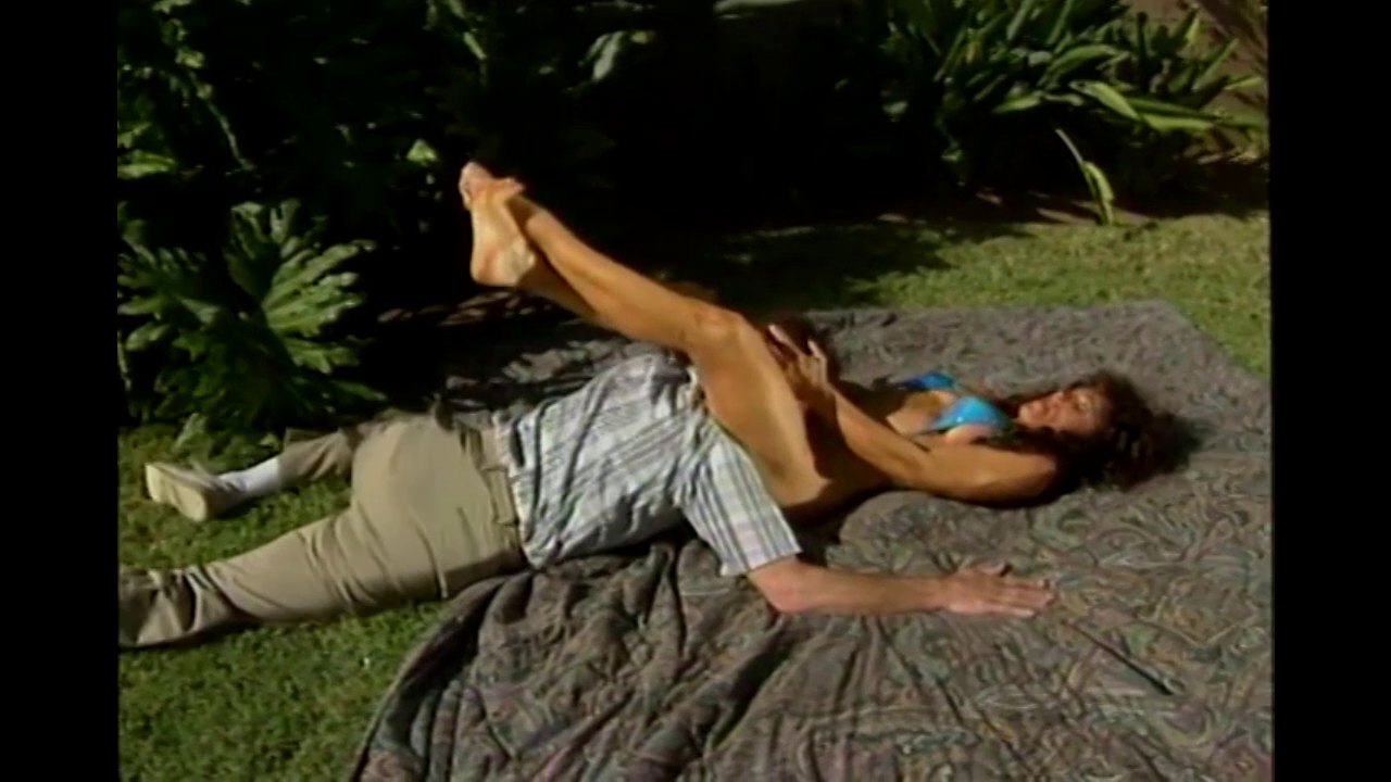 Nancy posing down on the blanket which is laid out across the grass, an intruder spies on her through the bushes. This peeping-tom is getting aroused by Nancy's sensual movements on the blanket and is soon discovered by the busty brunette. Nancy beckons him to her and promptly wraps her vice-like legs around his neck. He squeezes him with all her might, making him squeal in pain. Of course, it becomes very clear that he's actually enjoying it! In a line that is used for the rest of the video, he says "that hurts so good." Corny? Yes, but it's also quite funny.