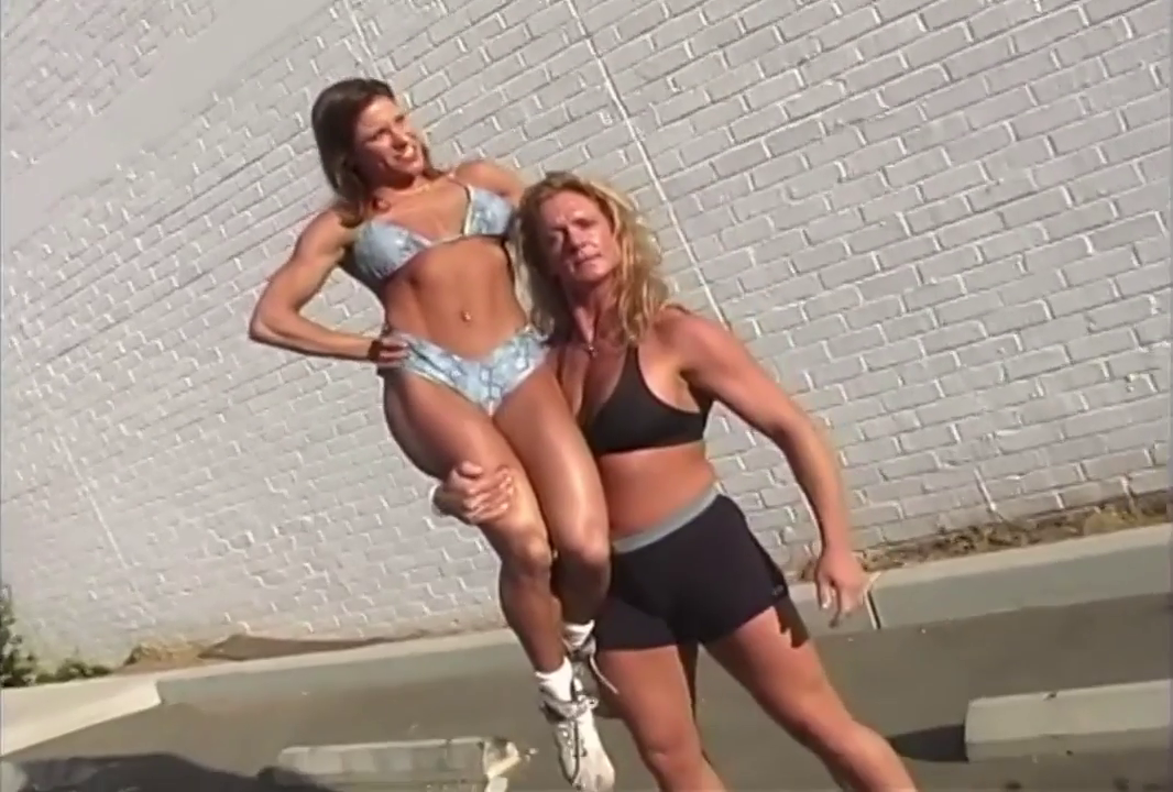 Big tough MISTY, a New York City bouncer with a powerful build and the proud face of a lioness, throws the iron around. After warming up with overhead presses she moves to her forte, the leg press. She maxes out the machine at somewhere around 1400 pounds and that still isn't enough, so sexy, 126-pound KRISSY sits on top of the weight stack and goes for a ride. Outside Misty presses Rob and Krissy with ease then carries Rob around like he weighed no more than a backpack, and does it all with her patented New York attitude. "Forgetaboutit." After that Misty and Krissy go out into the sunshine for a playful posedown. Big Misty totally overshadows little Krissy in the muscle department, but Krissy is a born tease and likes to show off what she's got. Lots more lifts here as Misty carries Krissy around on her shoulders and in her arms like a baby.
