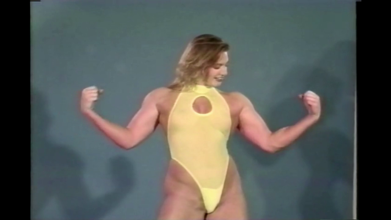 Annette ! Wow! At 5'9", 160 pounds, this gal knows how to bump and grind. She's an exotic dancer, so needless to say, her posing routine will melt you into a quivering mass of jello. Check out her glutes, they are like beach balls! So perfectly round and hard. Oh did I mention those spectacular thick, sculpted biceps, which just exude strength and power. She wears a yellow bathing suit, which looks amazing next to her bronzed physique. Annette comments how when she's dancing many guys prefer her to flex than to dance. I can't blame them one bit! You'll fall in love with Annette!
