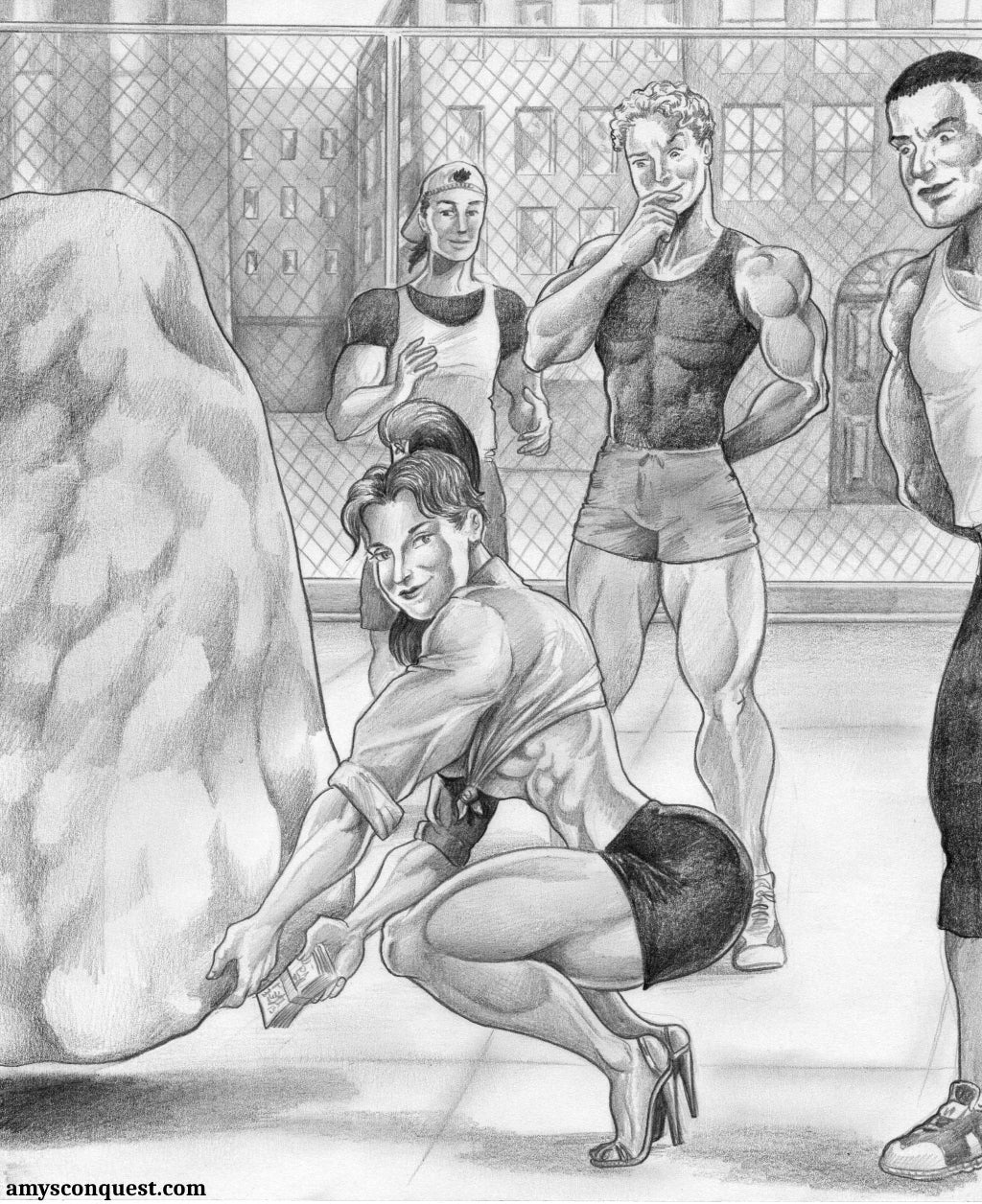 Just as a final game of basketball is about to end for a trio of cocky male jocks, in strolls the form of a curvaceous young woman, who is foolish enough to challenge all three to a game (with her heels, no less); though it's soon the males who are deemed the fools as they are overwhelmed on and then off the court, but this unbeatable female specimen! Fantastic artwork by Dracowhip on this Jack Straw tale!